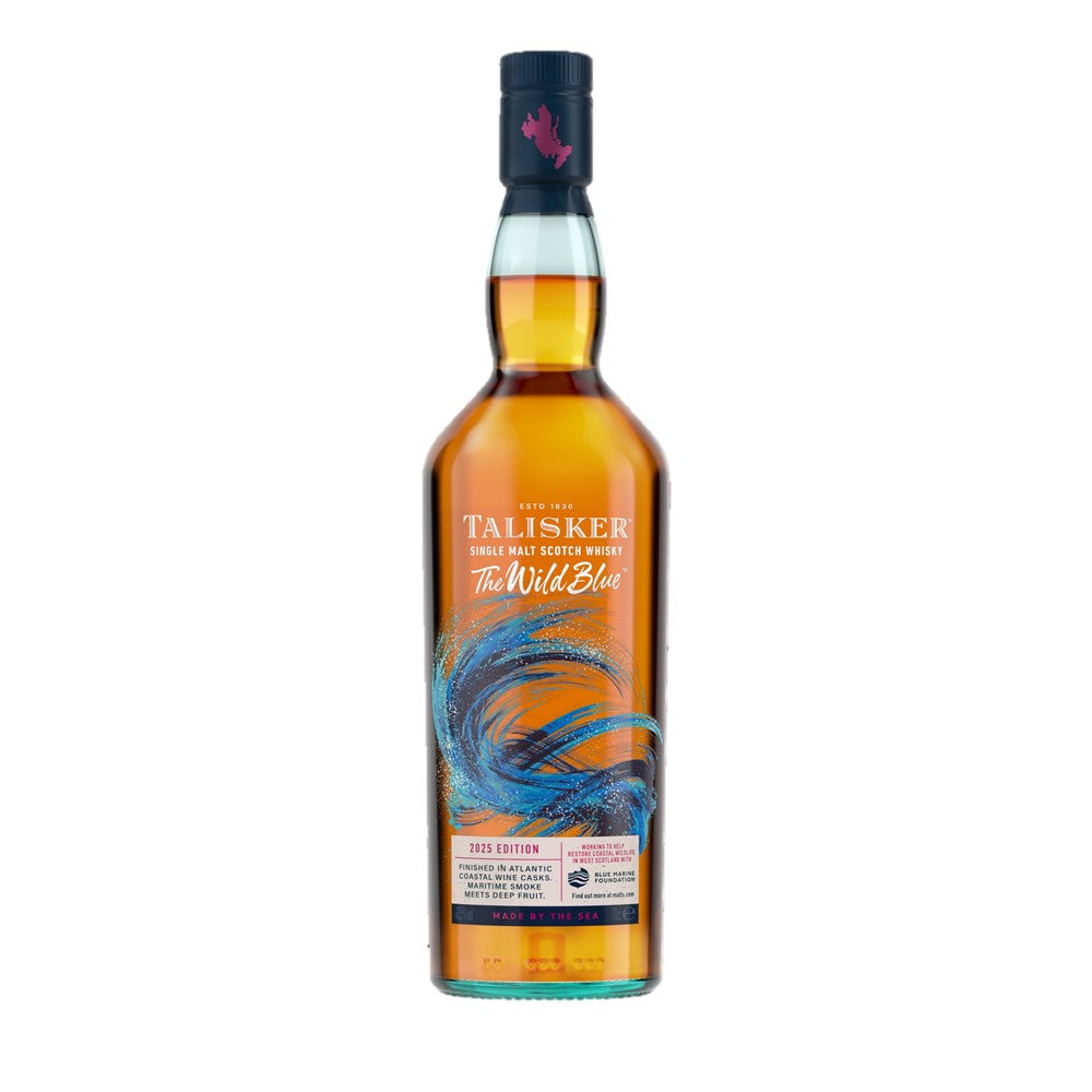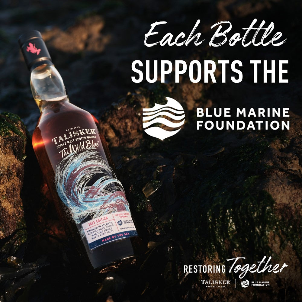 タリスカー ワイルド ブルーは、南アフリカワイン樽のファーストフィルで追加熟成され、タリスカーがもつ潮風の香りとスモーキーさ、奥深い果実の香りの見事な融合が愉しめる逸品です。1本購入されるごとに3ポンドが海洋保護団体Blue Marine Foundationへ寄付され、海洋環境保護活動をサポートします。ボトルには100%リサイクルガラスを使用、ギフトボックスを廃止し、ラベルも削減した環境に配慮したパッケージを採用。豊かな海を守り次の世代につないでゆく思いが込められた限定商品です。